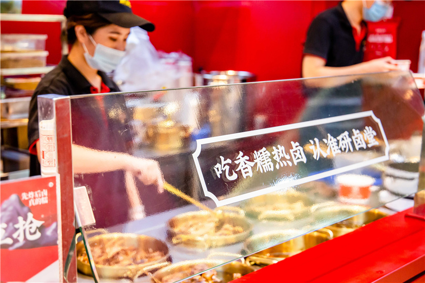 与众不同,是年轻人的标签。研卤堂主打的热卤品类,有别于传统的冷卤,更多作为佐餐或者家庭消费;而是当天现卤现捞,放在保温锅炉中,顾客点上一份,现场拌料出品,即买即食。刚出炉的热卤,口感软糯,喷香扑鼻。